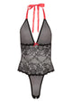 This all-in-one two piece outfit has a bra and panty appearance, but is actually attached with a neck choker and vertical belly strap for a uniquely sexy look! Stretchy black mesh bra cups and panties attach at the front to a satin strap with lace adornments at the belly and neck, creating a kinky appeal, enhanced further by the satin waistband and lace feature at the back of the bra.