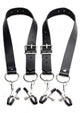 Remind your slave that his place is at your feet with a sick and twisted bondage contraption. The wooden Humbler will keep him on his knees with his ass exposed, locking onto his stretched out scrotum. Curved to fit below his ass, this device will tug on his balls and prevent him from standing, keeping him bent over and at your mercy! Knobs at either end make it easy for you to open and close the Humbler. Clasps allow you to attach or remove a pair of ankle restraints to keep him even further restrained! The comfortable interior of the cuffs ensures that his mind will be on the predicament his testicles are in while he is immobilized. Locking buckles give you the option of furthering his plight, giving him no hope for escape!
