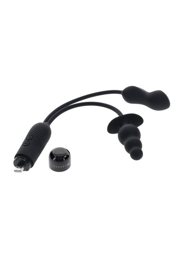This double-motor toy features two vibrating shapes – a beaded plug and a mini-vibe - each tethered by a flexible cord. The round-tip plug consists of 3 bulbs that gradually increase in size to a wide safety base. The chunky-shaped mini-vibe narrows at the center and finishes with a flattened, blunt tip. A USB plug is neatly stored under the textured handle’s screw-off cap.