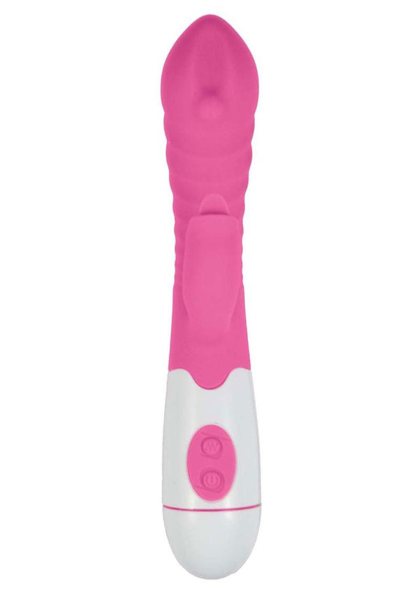 The Lotus Sensual Massager #5 features dual-motors to deliver powerful vibrations. The soft, flexible silicone shaft is curved to reach the g-spot and ribbed for added stimulation while the clitoral tongues deliver a licking sensation. Twist open the bottom compartment of the vibe to insert two AAA batteries. To power on, press and hold the bottom button on the control panel then press the top button to cycle through the 30 vibrating patterns. Available in Pink and Purple.