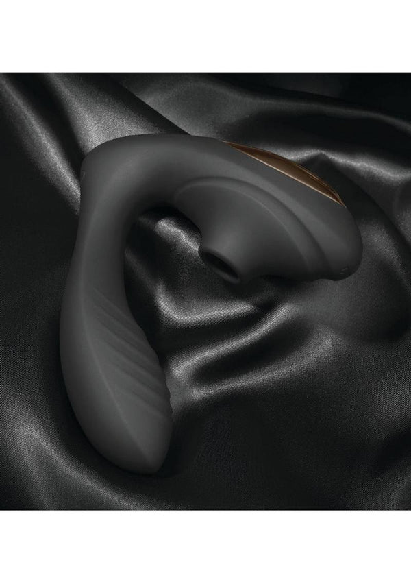 This dual-functioning massager offers simultaneous clitoral and G-spot pleasure. Enjoy creating the perfect combination of internal vibration and clitoral air pulse stimulation with separate controls. The flexible design allows for comfortable pressure for any body type. While the high-quality silicone feels soft to the touch and provides a smooth surface allowing for easy cleaning. The rechargeable motor will ensure you get all the play you can handle. Unleashing powerful dual stimulation. Reach new heights of orgasmic pleasure with this luxurious dual stimulating vibe. Featuring 10 internal vibration patterns, as well as 10 levels of clitoral pleasing intensity, this toy will have you feeling like royalty. Bursts of gentle air mimic clit sucking sensations while the flexible internal arm offers a sense of desirable fullness and deep-pleasing vibrations.