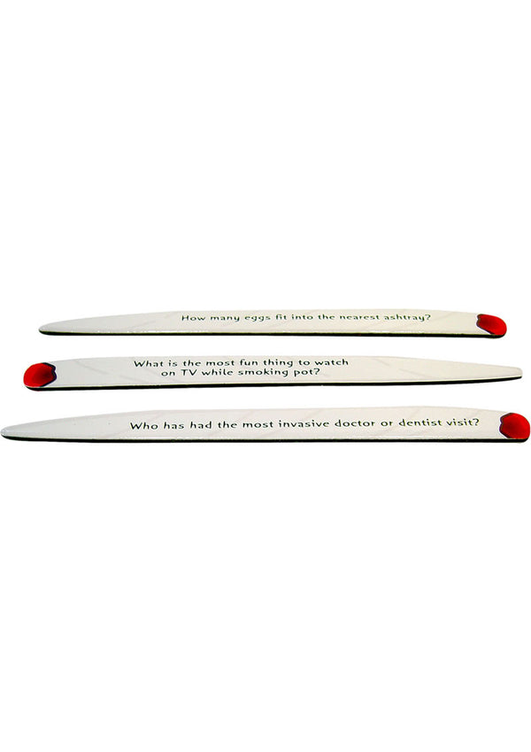 Players take turns selecting one of the 50 joint discussion sticks and reading one of the sides aloud. After which, they discuss each topic and collectively agree on an appropriate answer together. For 4-20+ players.
