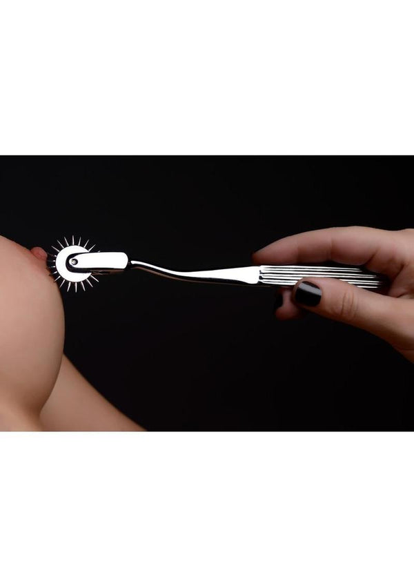 Test the limits of sensitivity play with the Odax Sensation Wheel from the Master Series. Run this premium spiked wheel across the skin and other highly treasured areas for an exciting prickle of pleasure. Made of stainless steel and deviously designed with a row of evenly spaced sharp pins that turn smoothly as it rolls across the flesh, the Odax is ideally designed for intense, exquisite pleasure. Take it to the next level with a little temperature play...the slick material of the Odax can be warmed or cooled for an extra spike of sensation.