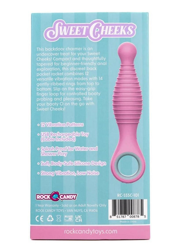 Rock Candy Toys introduces Sweet Cheeks! This backdoor charmer is an undercover treat for your Sweet Cheeks! Compat and thoughtfully tapered for beginner-friendly anal exploration, this discreet back pocket rocket combines 12 versatile vibration modes with 14 gently-ribbed rings from top to bottom. Slip on the easy-grip finger loop for controlled booty probing and pleasing. Take your booty O on the go with Sweet Cheeks!