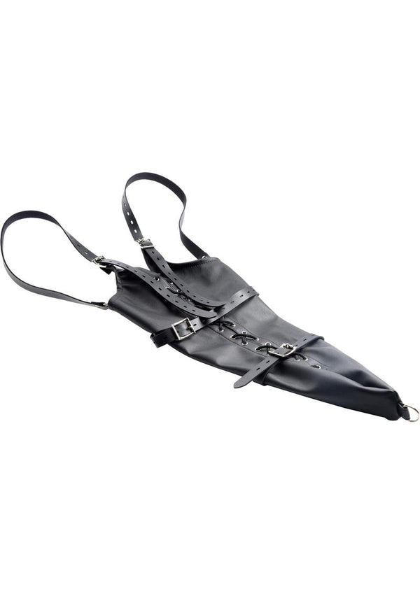 Pinch your partners arms together behind their back to fully restrain them for your amusement! This full sleeve is a unique piece of bondage gear that effectively takes your scene to the next level. Slip your playthings arms into the sleek, attractive sleeve, secure the laces, and adjust all four of the straps to a tightness that will keep them trapped, but comfortable... if that is your desire! Locking buckles allow you to further their plight and ensure that there is no hope for escape. A D-ring at the bottom even allows you to get creative with other BDSM attachments. Have your way with that vulnerable body while they squirm in pain and pleasure!